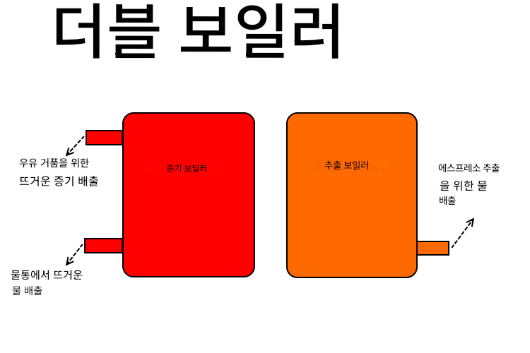란실리오 실비아의 세코 아로마 에스프레소 머신처럼 보일러가 하나만 있는 에스프레소 머신(싱글 보일러)은 추출과 스티밍 과정을 동시에 진행할 수 없습니다. 보일러가 하나이기 때문입니다.
