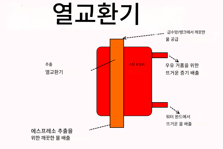 열교환기는 특정 유형의 싱글 보일러 에스프레소 머신에 추가된 기능입니다. 따라서 모든 싱글 보일러 에스프레소 머신에 이 기능이 있는 것은 아닙니다. 표기는 매우 간단합니다. 보일러 내부에는 상단이나 하단의 보일러를 통과하는 일종의 파이프나 튜빙이 있습니다. 이 튜빙을 열교환기라고 합니다.